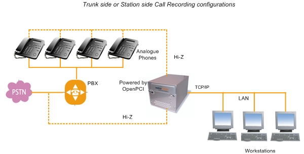 - Providing call logging/monitoring functionality to existing phone systems. Take a PC server with the OpenPCI-8L card running Linux (ie. Telephony server) and tap the card's ports to the telco trunk lines if only incoming and outgoing calls need to be monitored. If inter-office calls are also required to be monitored, then tap the PBX extensions instead of the trunk lines. Install, configure and run our hardware driver and VTlogger application software. Note: Only the tapping of standard analogue handsets is supported. Digital handsets found in keyed telephone systems (KTS) cannot be tapped using our technology.