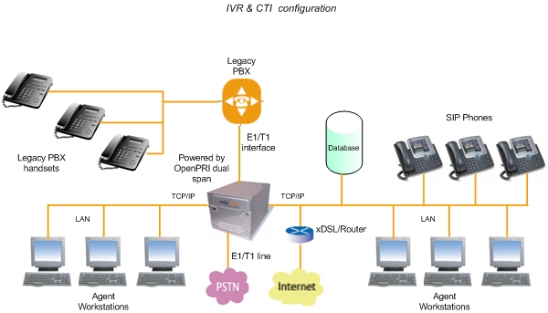 - An IVR answering service with CTI capabilities supporting circuit switched (TDM) and IP based PBX phone systems. Take a PC server with an OpenPRI dual E1/T1/J1 port card running Linux (ie. Telephony server) and connect one of the E1/T1/J1 ports to the telco line and the other to the PBX phone system. Install our next generation telephony driver (libctpp) and commence developing your own custom IVR and CTI solution.
