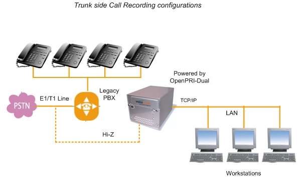 Primary rate E1/T1/J1 ISDN lines. Supports up to 60 voice channels. Optional PRI tap boxes provide the high impedance (Hi-Z) requirements to "passively" tap these primary rate lines for call logging/monitoring purposes. Note: You need 2 x E1/T1/J1 ports to passively tap a single E1/T1/J1 line (up to 30 voice channels). |